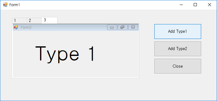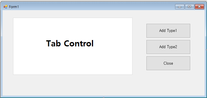 1. WinForm(Form1)에다가 tab control 1개(tabControl), 버튼 3개(btnAddType1, btnAddType2, btnClose) 입력