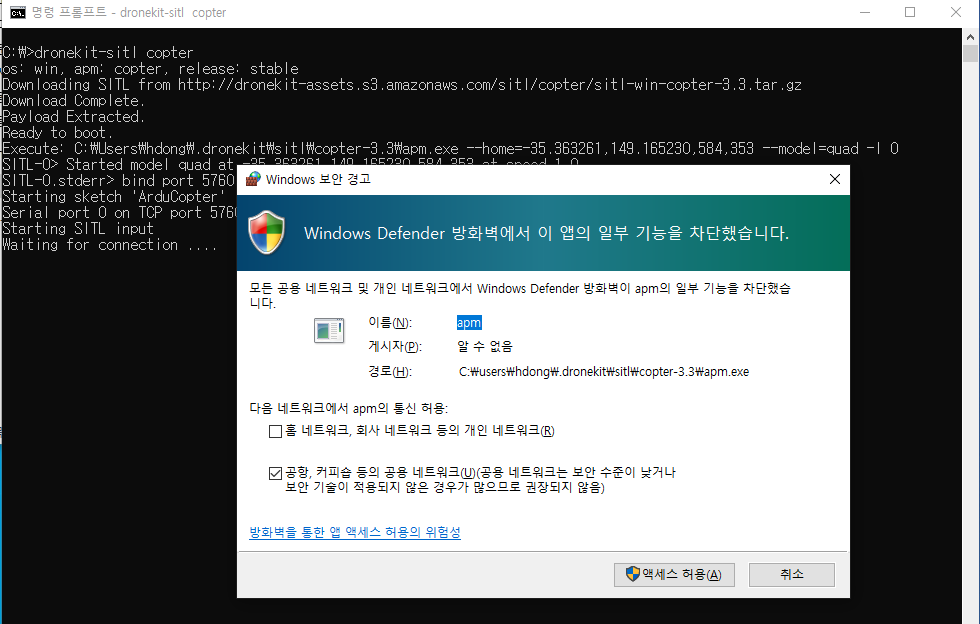 3-2. 다음 명령어로 한번 구동시키면 보안경고가 나오면 액세스 허용을 눌러준다.