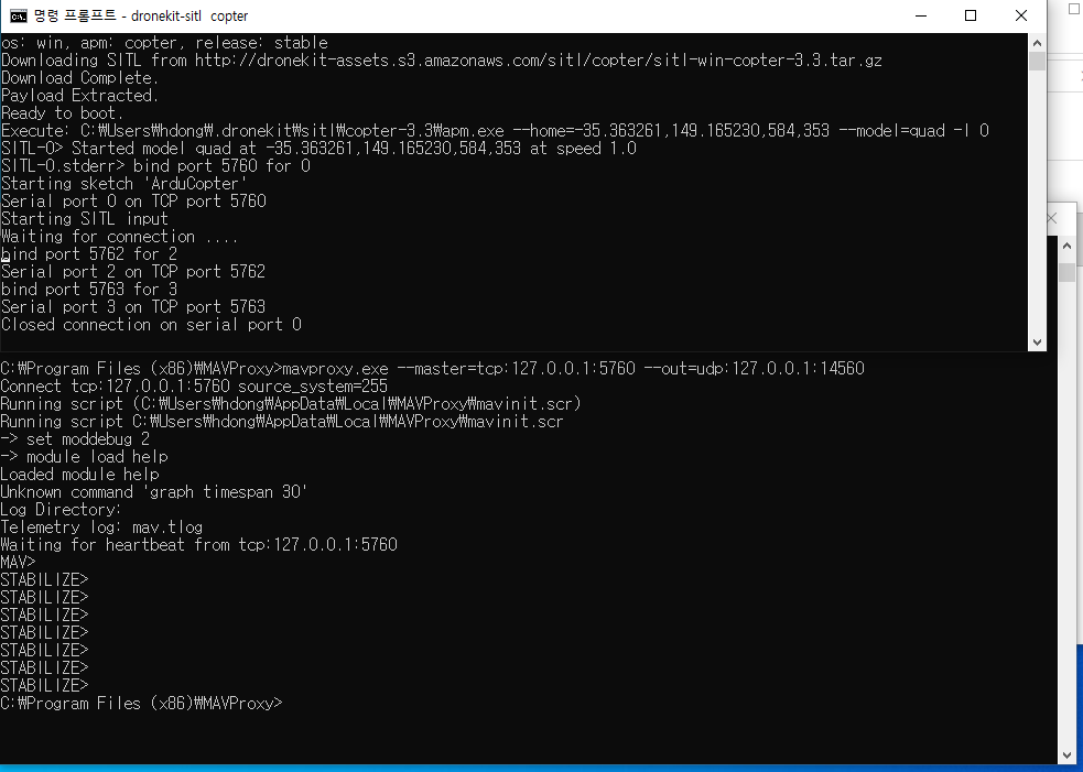 mavproxy.exe --master=tcp:127.0.0.1:5760 --out=udp:127.0.0.1:14560