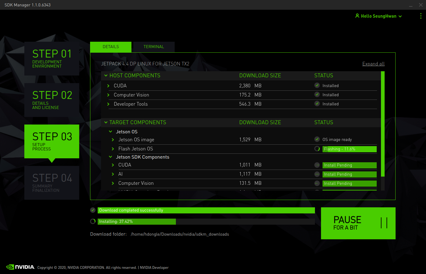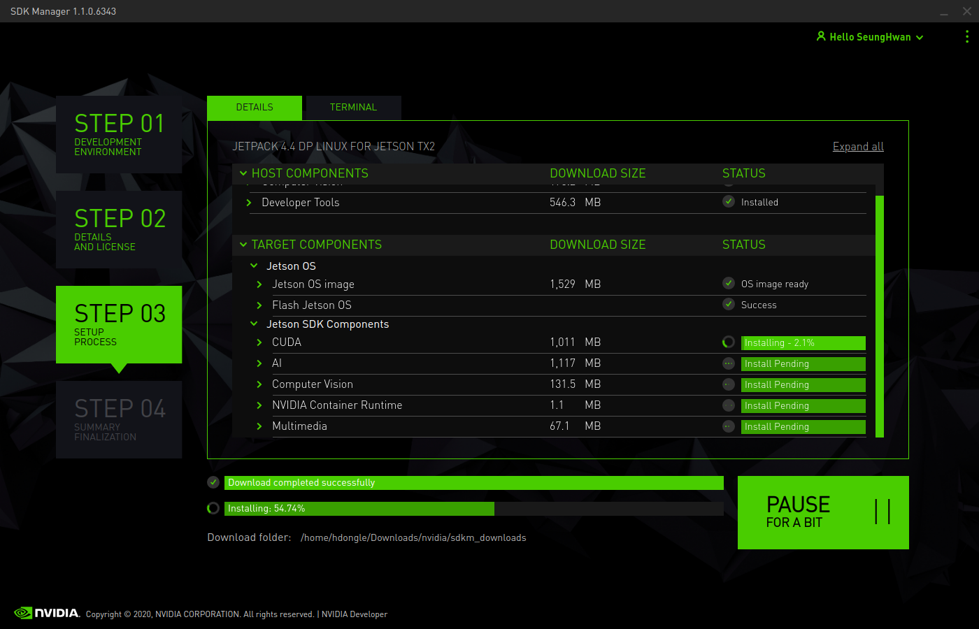 6. 아래 창이 나타나면 OS 이미지 쓰기가 끝났고, Jetson TX2화면에서 초기 설정을 마치고 OS가 구동됨을 확인한다.