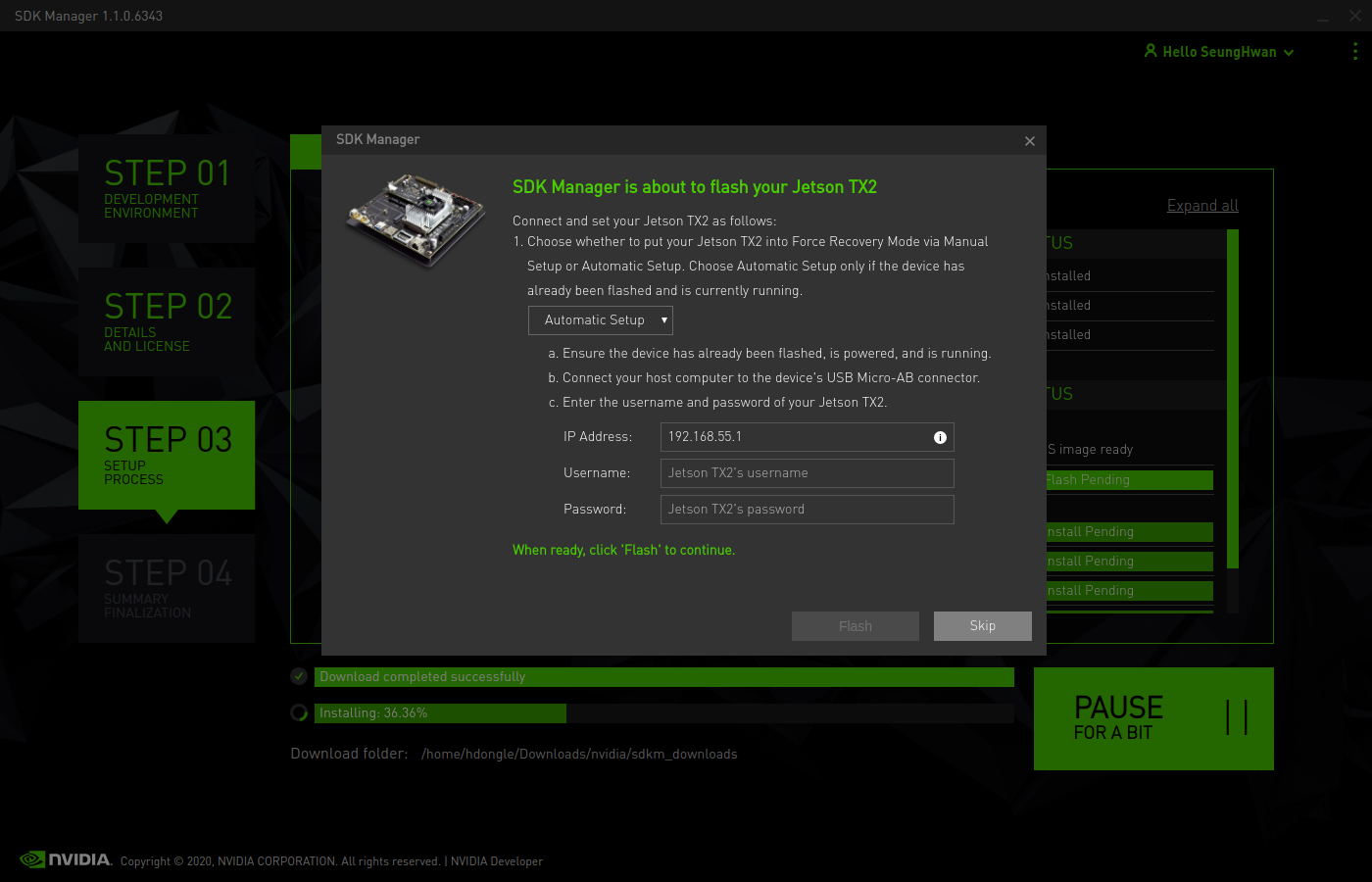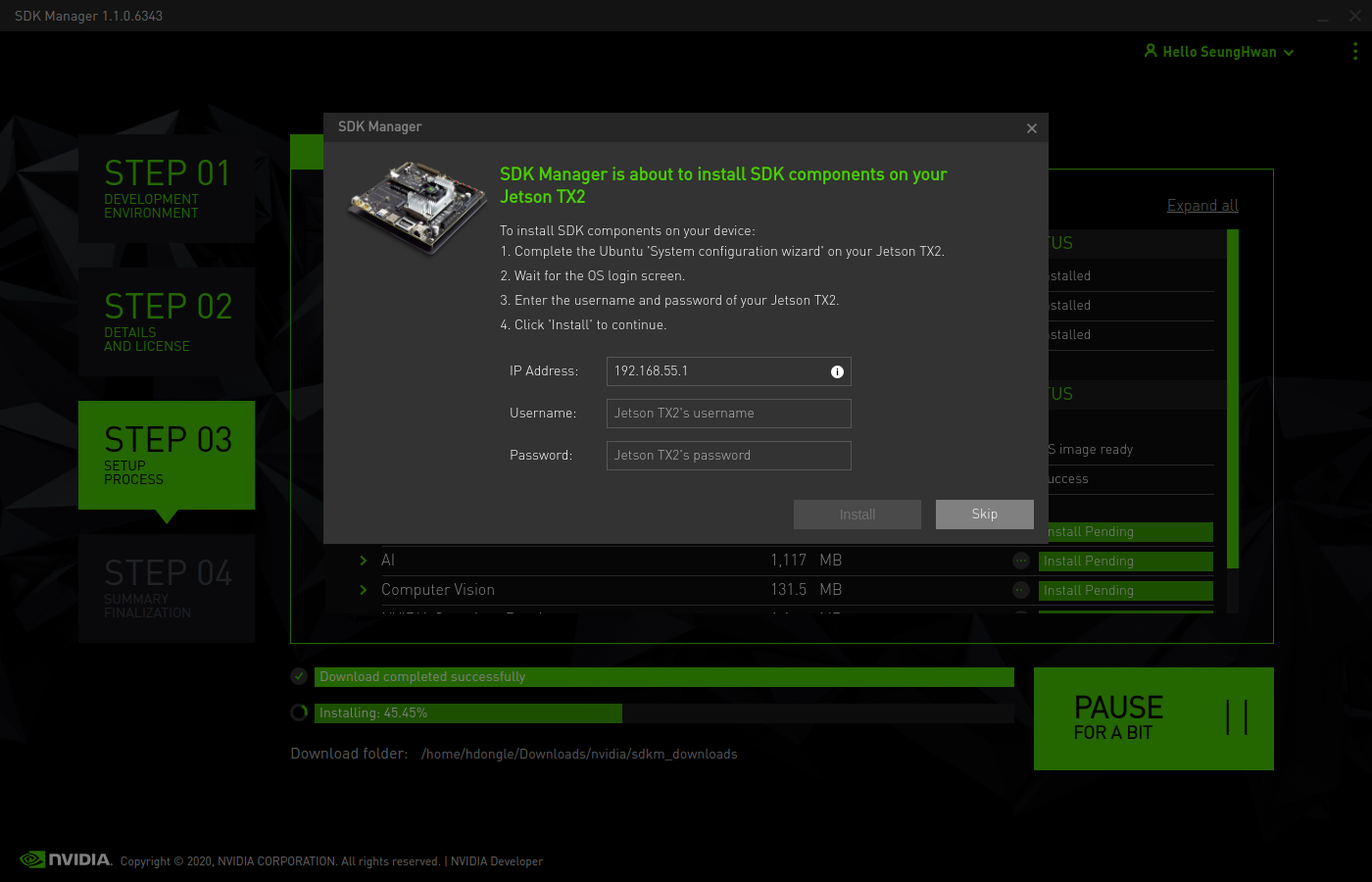 8. 호스트 PC에서 Jetson TX2 보드의 IP, Username, Password를 입력 후 Install 버튼 선택