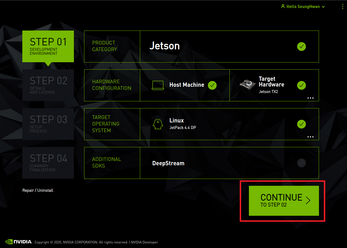 2. 호스트 PC에서 sdkmanager를 실행한 다음 CONTINUE(TO STEP 02)를 누른다.