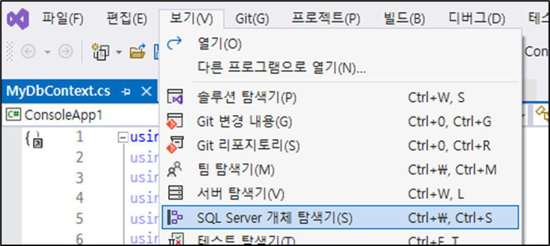 10. 서버를 연결 (보기 -> SQL Server 개체 탐색기)