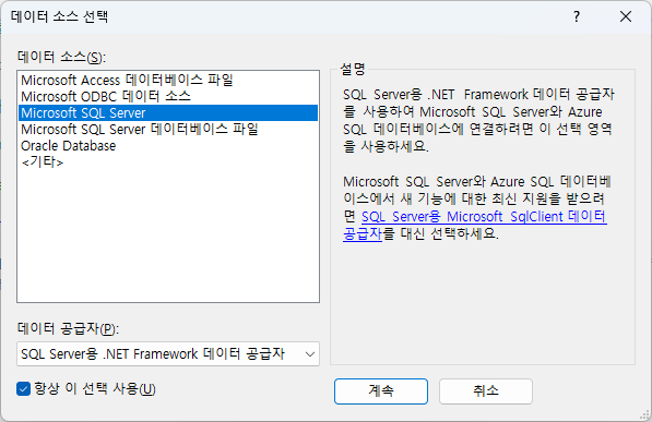 - 보기 > 서버탐색기 > 데이터 연결 > 우클릭 후 "연결 추가" > 아래의 창에서 계속 누르면 뭔가 설치하라고 나오는데, 설치하고 나면